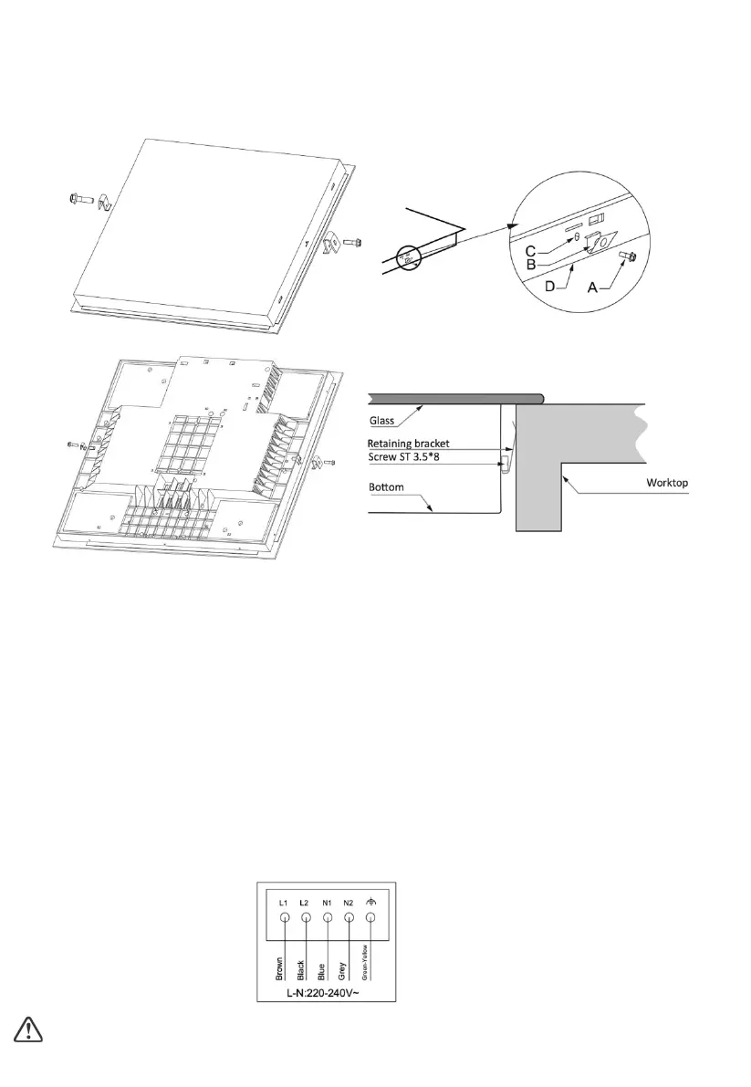 Fix the hob on the work surface by screw 2 brackets on the bottom of hob (see picture).