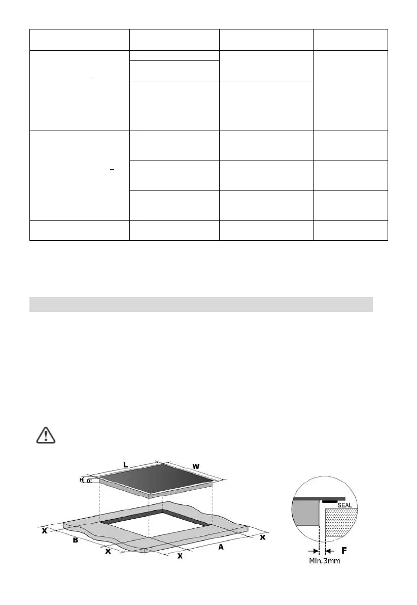 Note: The safety distance between the sides of the hob and the inner surfaces of the worktop