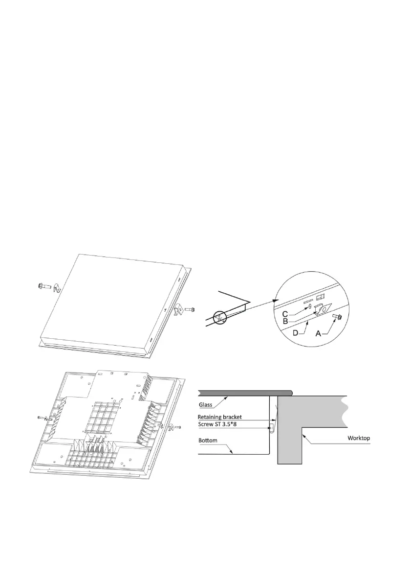 Fix the hob on the work surface by screw 2 brackets on the bottom of hob (see picture).