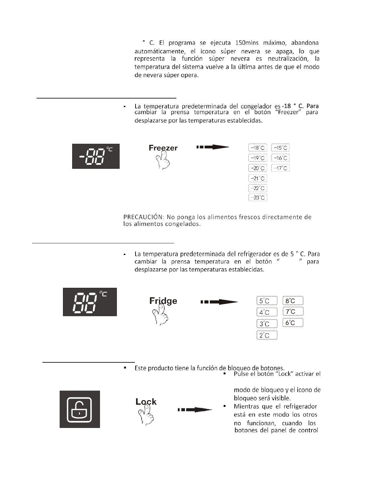 CORBERO CFFDS43623NFXINV - Bloqueo de Botones;Desbloqueo; Configuración del Compartimiento del Congelador; Configuración del Compartimiento del Refrigerador