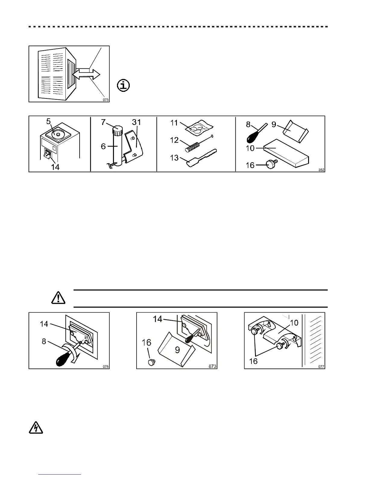 - if the chute [9] is supplied disassembled, install it under the extraction door [14] by screwing the knob[16];
