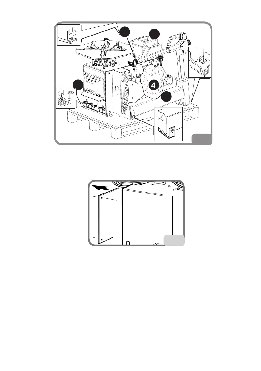 - Insert the tank 4 outlet into hose Q. Fix the tank 4 to the machine with nuts and washers