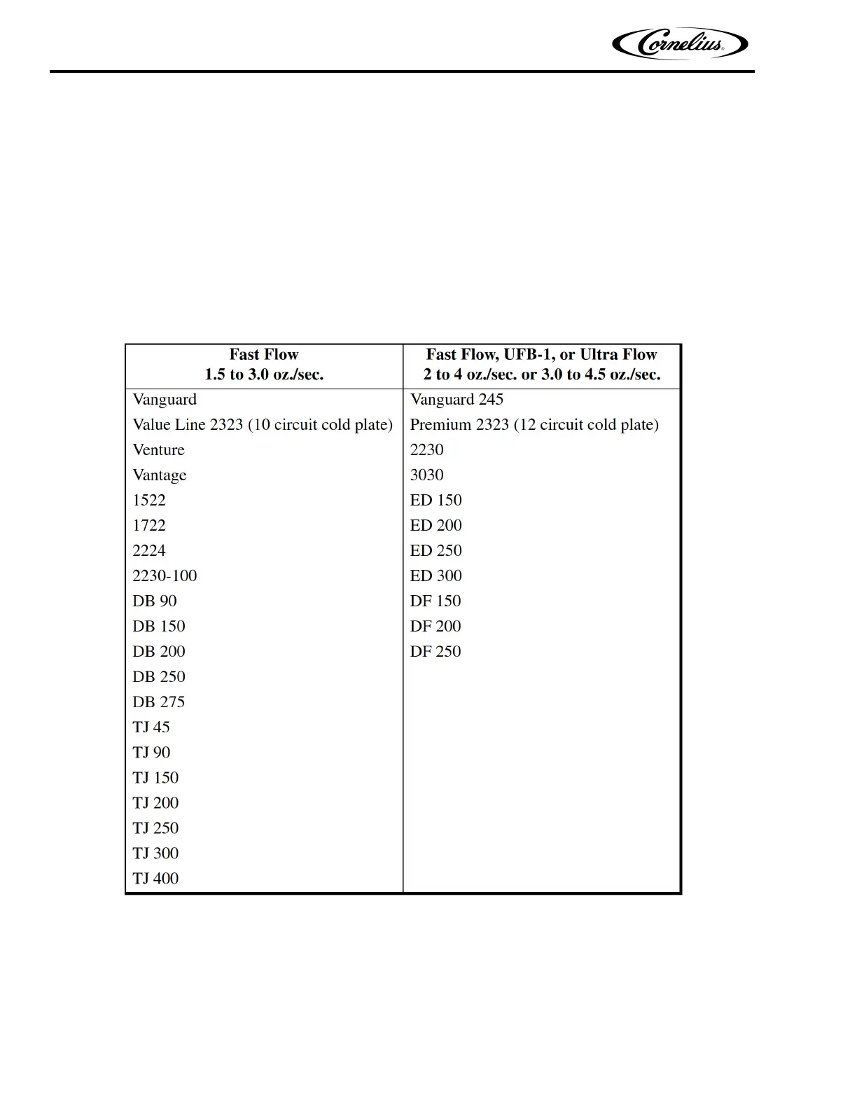 water and syrup. The following is a list of Cornelius units and the valve flow rates they support: