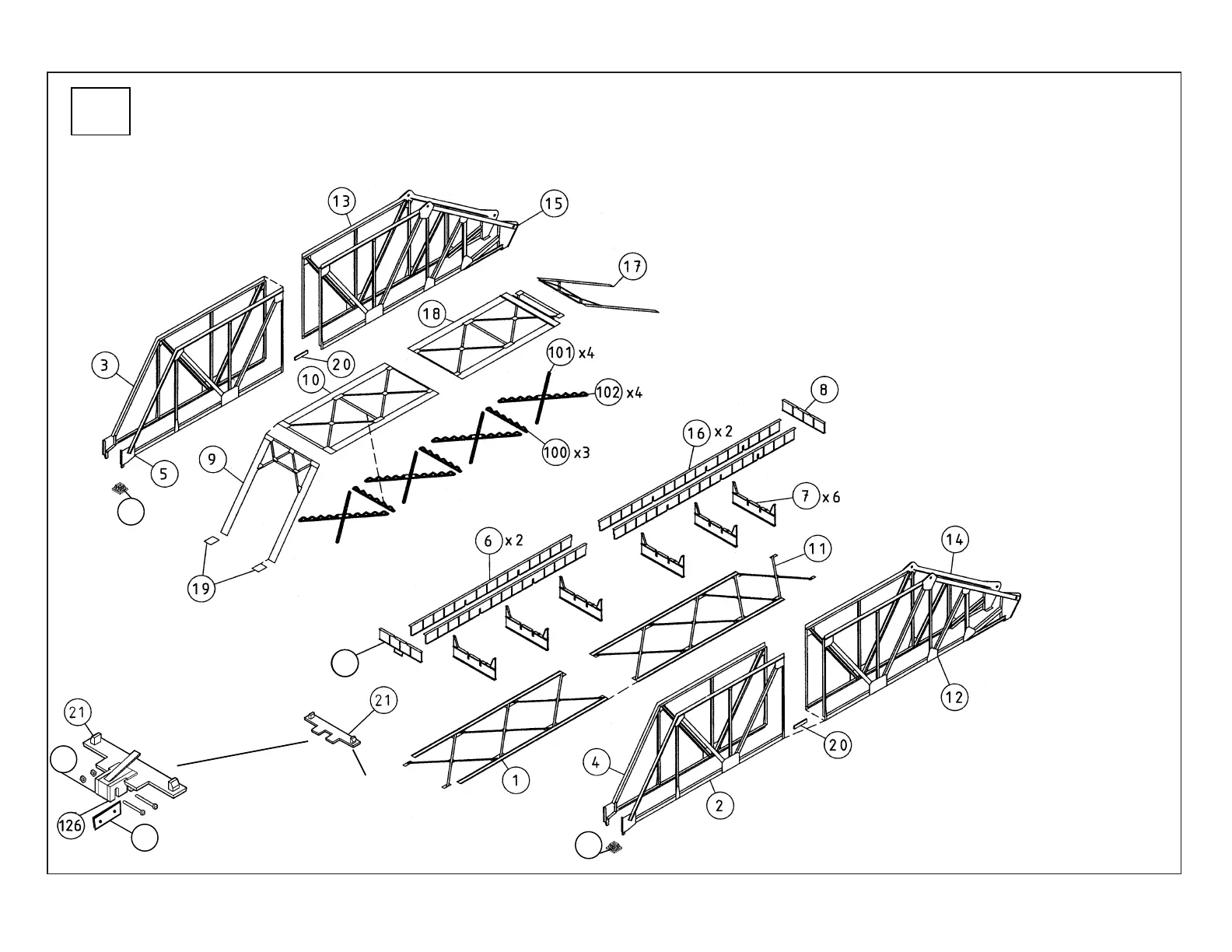Left End Girder (#128) is at the bottom: complete assembly by gluing to left end as shown; set aside to dry.