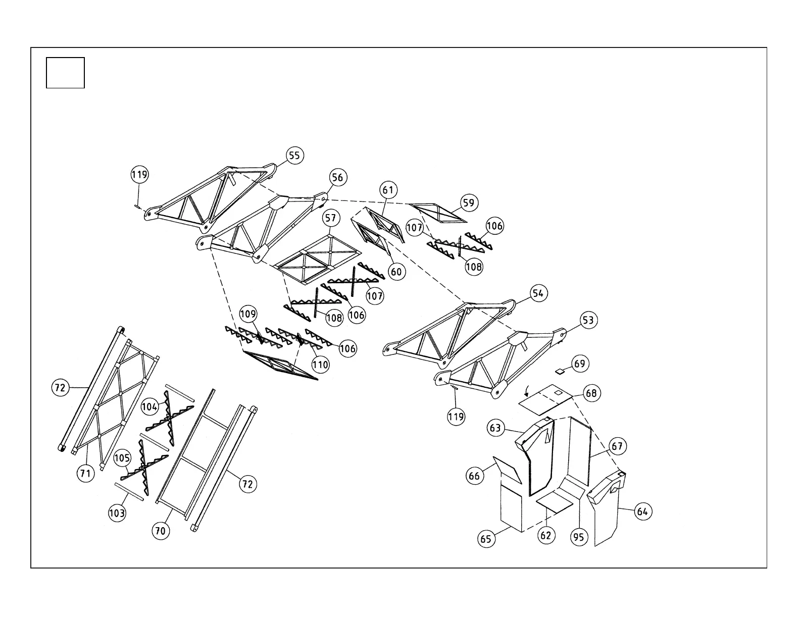 59). Glue Middle Bracing Halves (60, 61) together. Glue the Right (53, 54) and Left (55. 56)