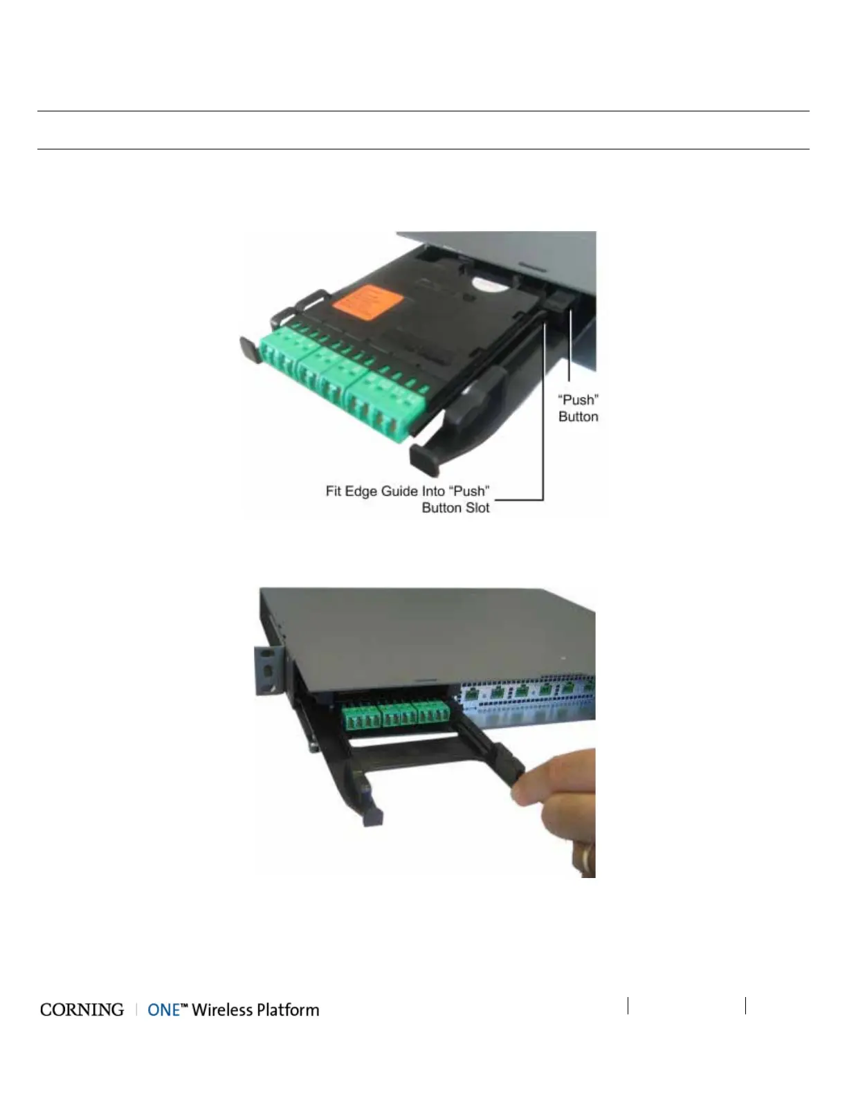 2. Slide in the Edge module between the guides and fit the module guide into the tray “Push” button slot, as shown in