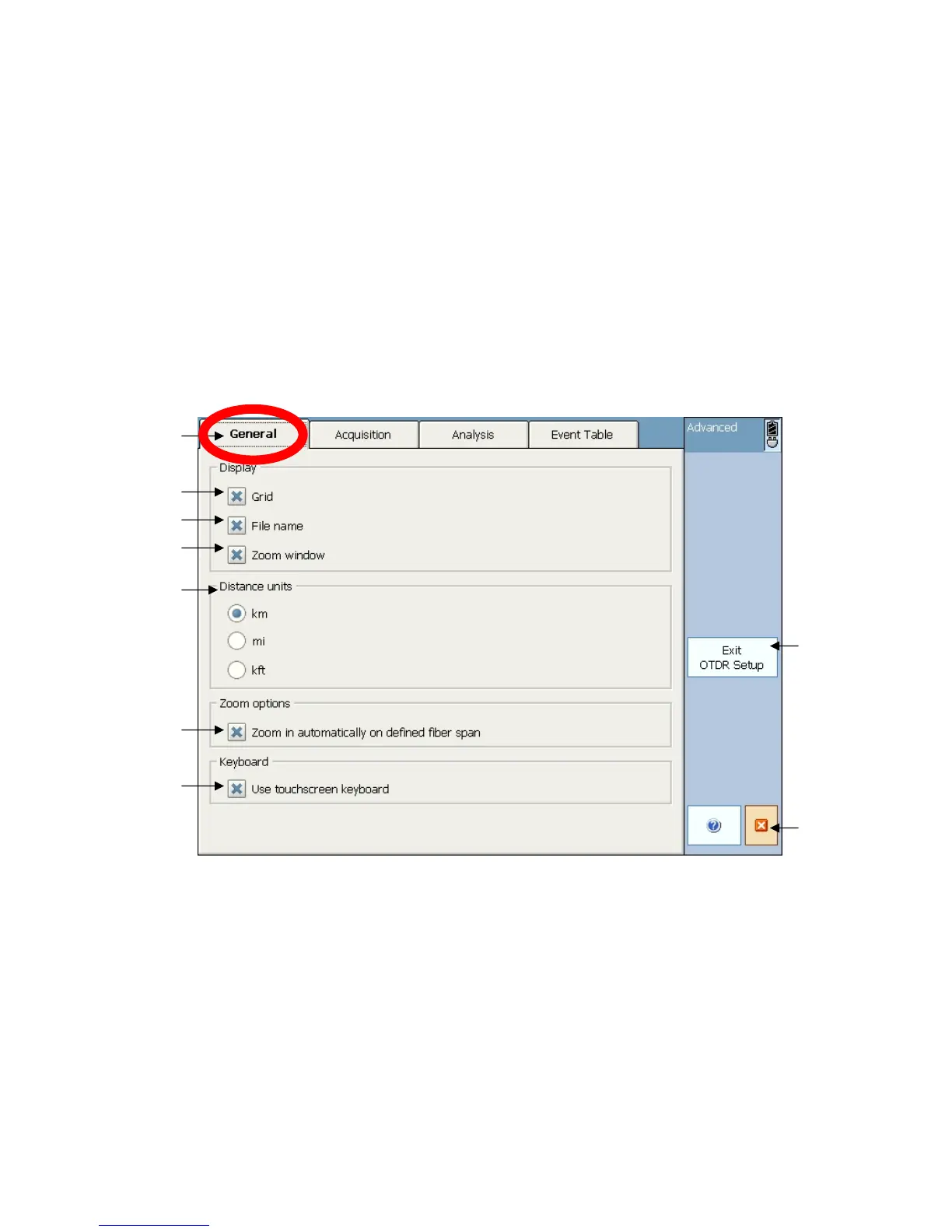 8. Exit OTDR Setup button- press this button to exit setup and save settings