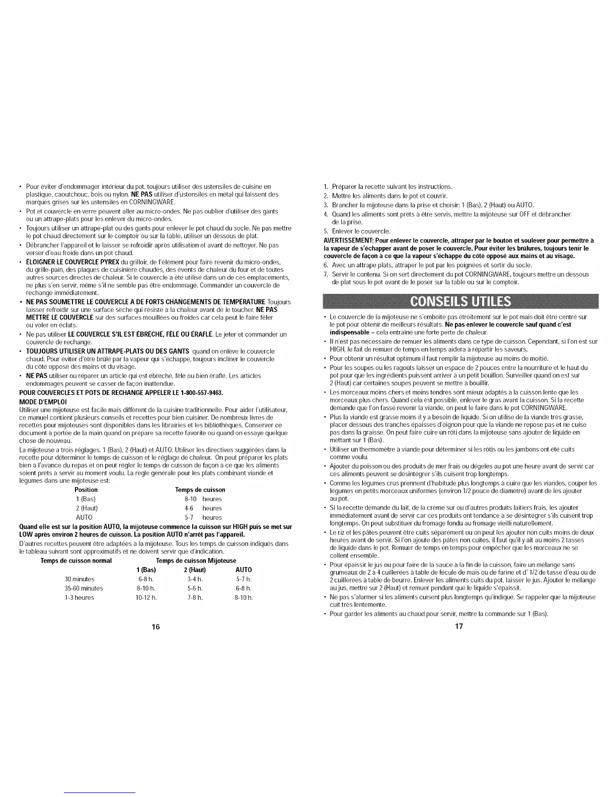 • Ne pas s'alarmer si los aliments cuisent plus Iongtemps qu'indique. Se rappeler que la mijoteuse