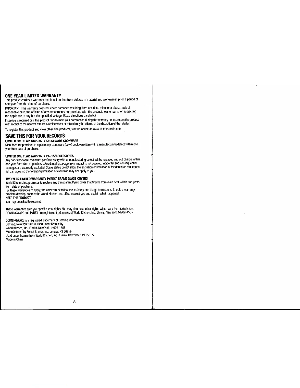 CorningWare SC-60 - Warranty Information; Limited One-Year Warranty; Specific Component Warranties; Trademark and Manufacturer Details