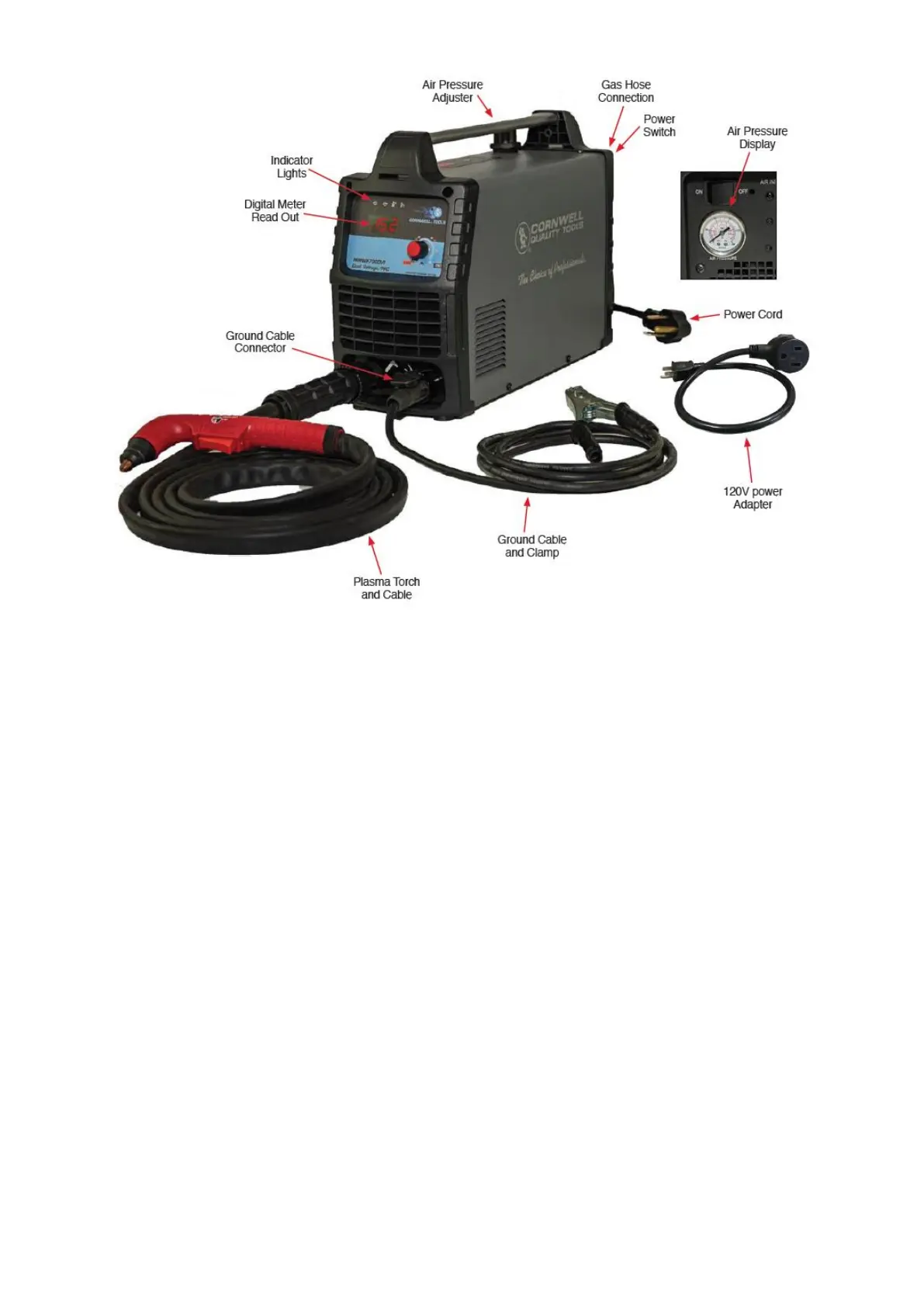 The built-in air display is used for reading the output gas pressure when cutting.