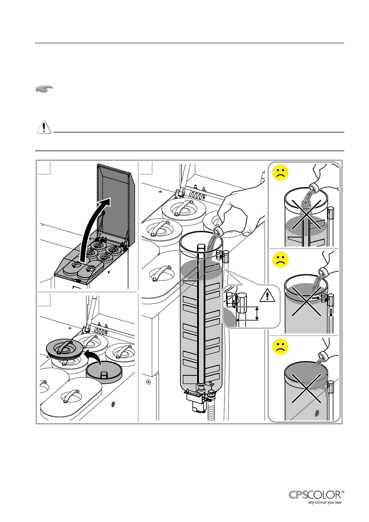 Update the colorant level value for the topped up canisters in the machine management software (refer to 8.
