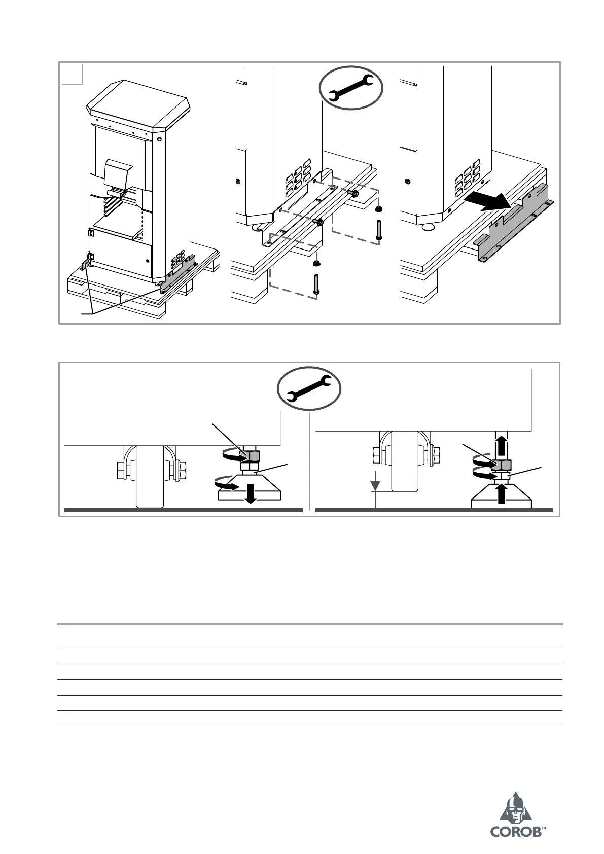 6. Lower machine feet to support and level the machine properly, and make sure that the wheels are not