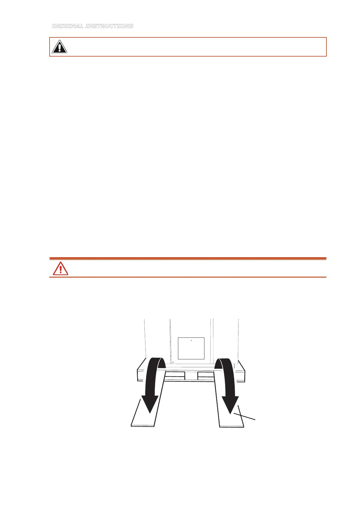 1. Lower both platforms (1) hinged to the pallet, making sure they rest evenly on the floor and
