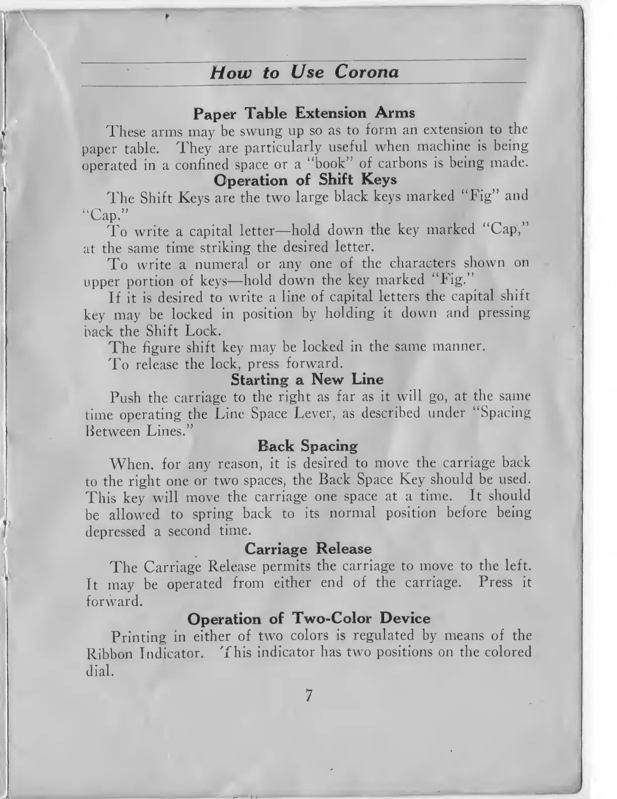 CORONA 3 - Paper Table Extension Arms; Operating Shift Keys; Starting a New Line; Backspace Key Usage