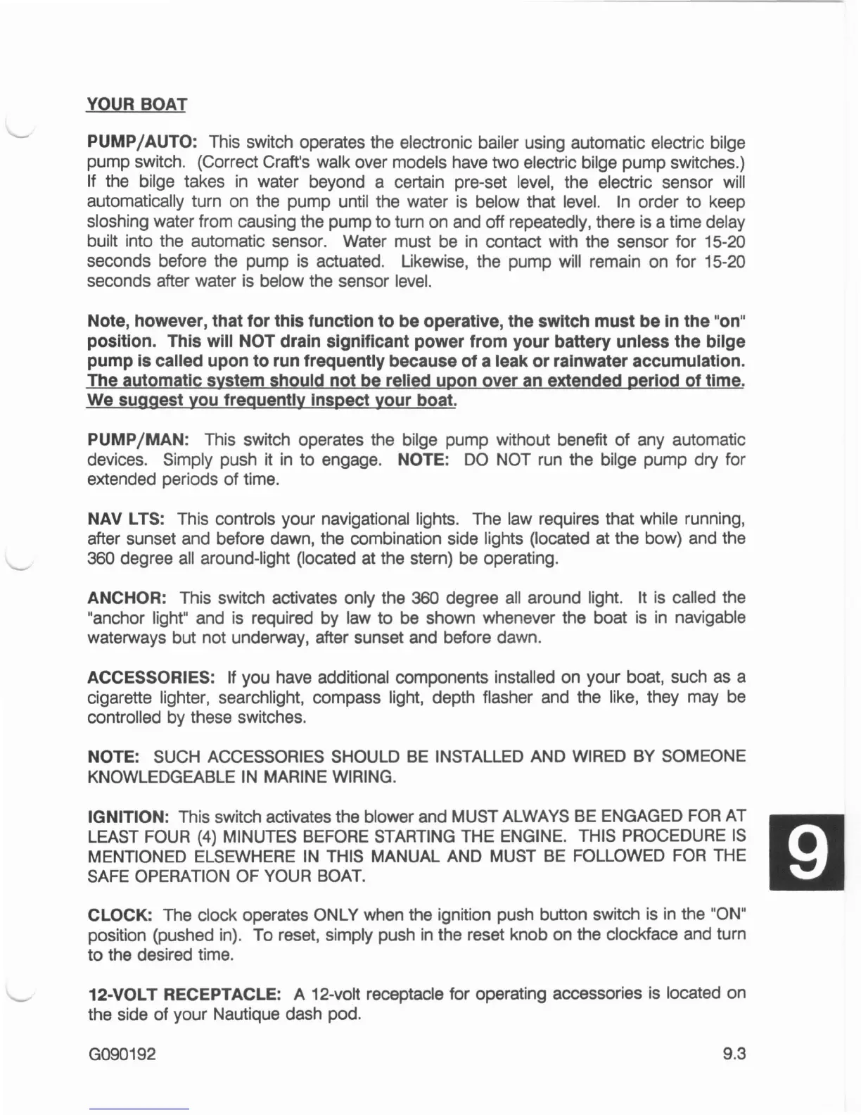 (Correct Craft's walk over models have two electric bilge pump switches.)