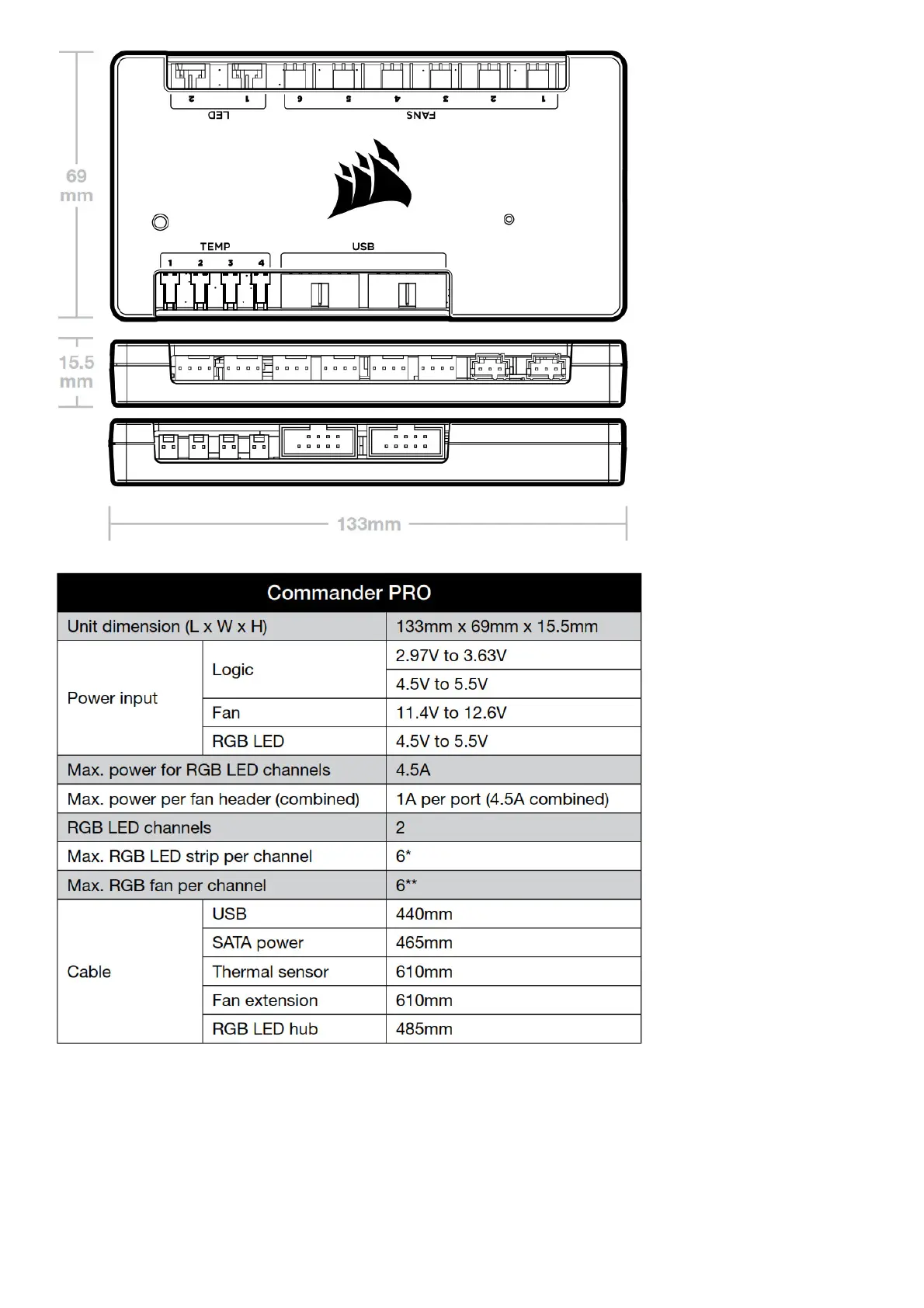 Corsair COMMANDER PRO - Dimensions and Power Input; Cable Specifications; Installation; Mounting and Connections