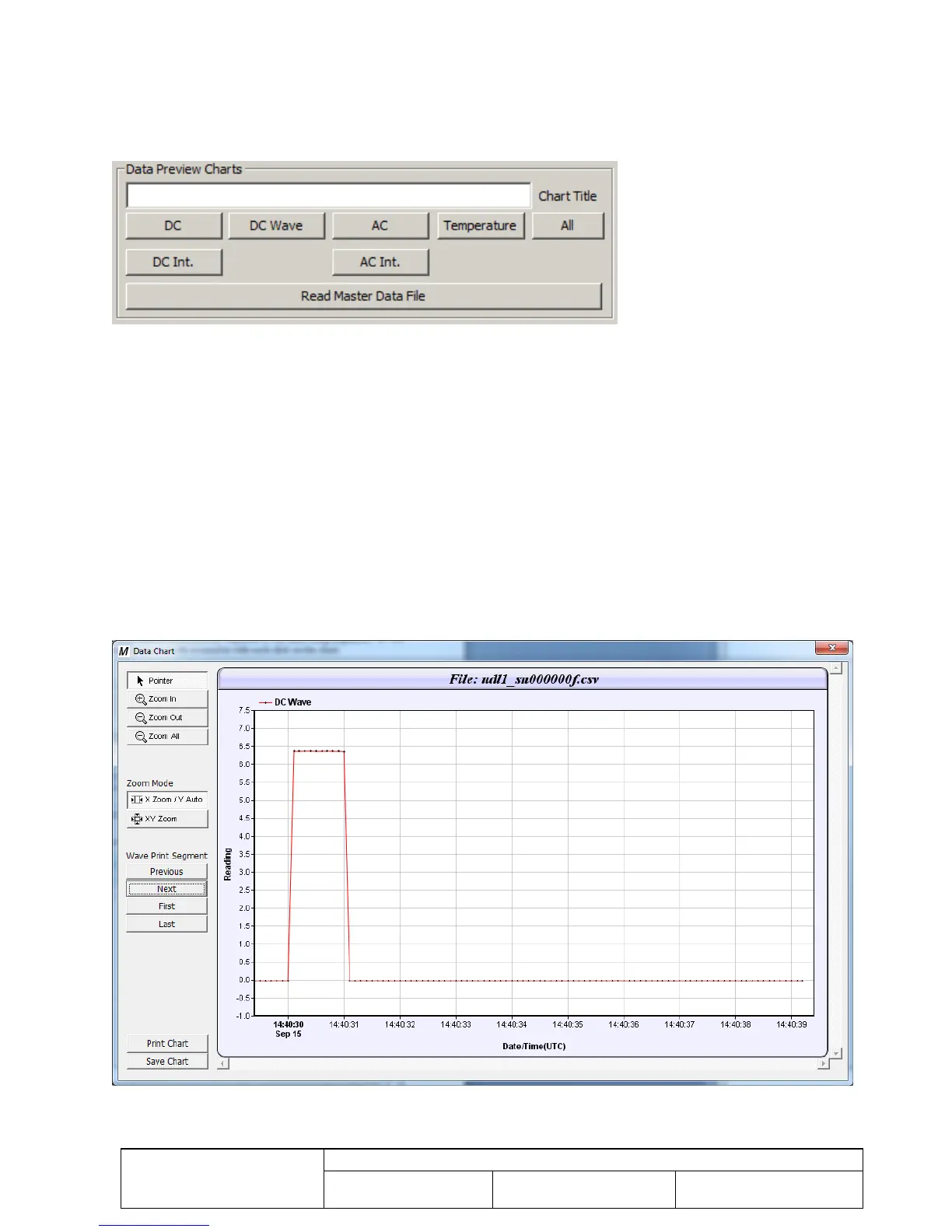 “DC”, “DC Wave”, “AC”, or “Temperature” buttons to bring up a zoom-able chart of the associated data. For units