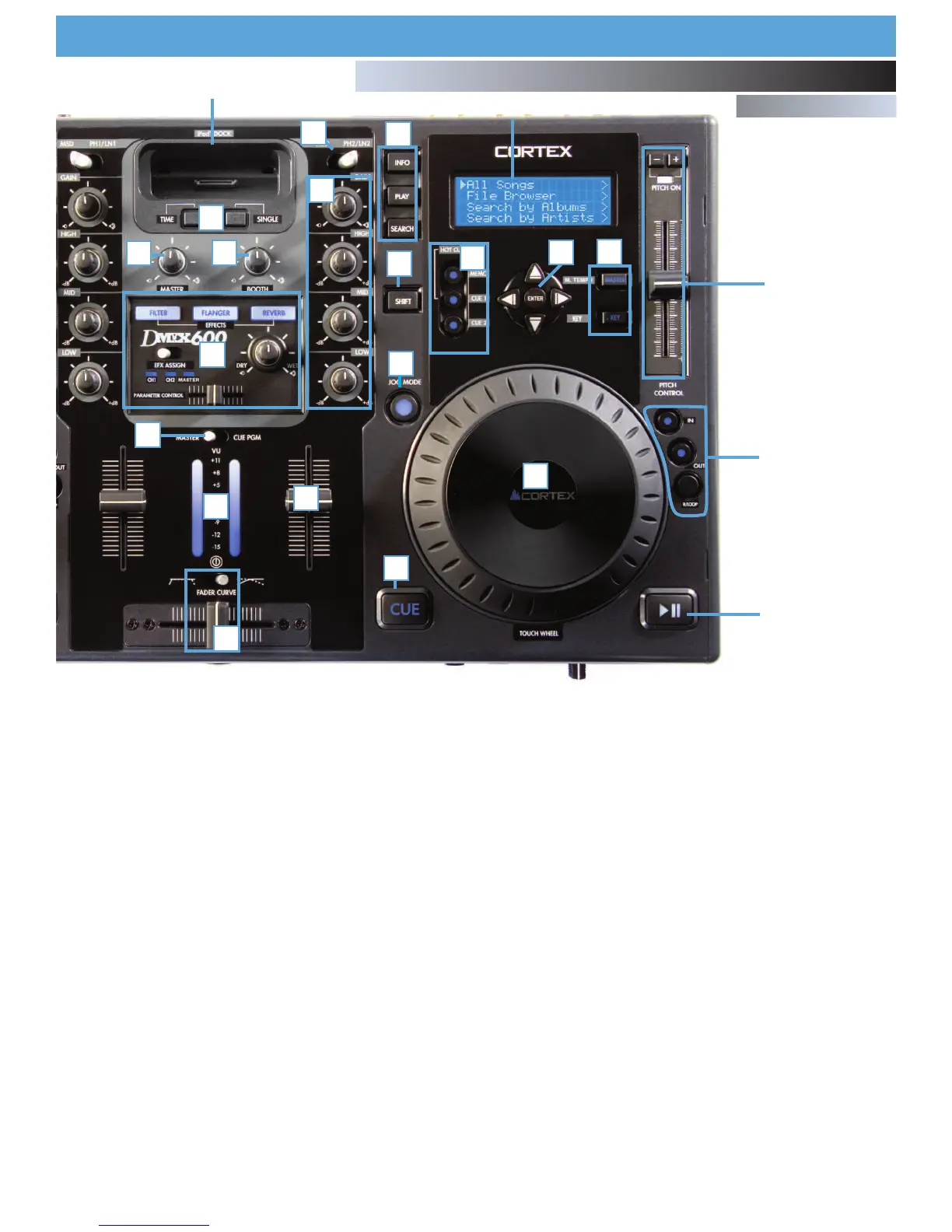 22.Pitch Fader, PITCH ON/OFF indicador y botones PITCH BEND