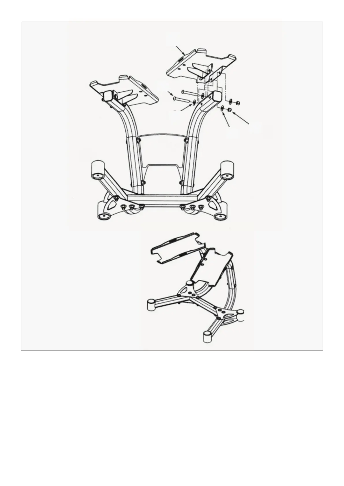 1. Secure the Right Dumbbell Platform (#6) to Right Stand Leg (#4) using the bolts shown.