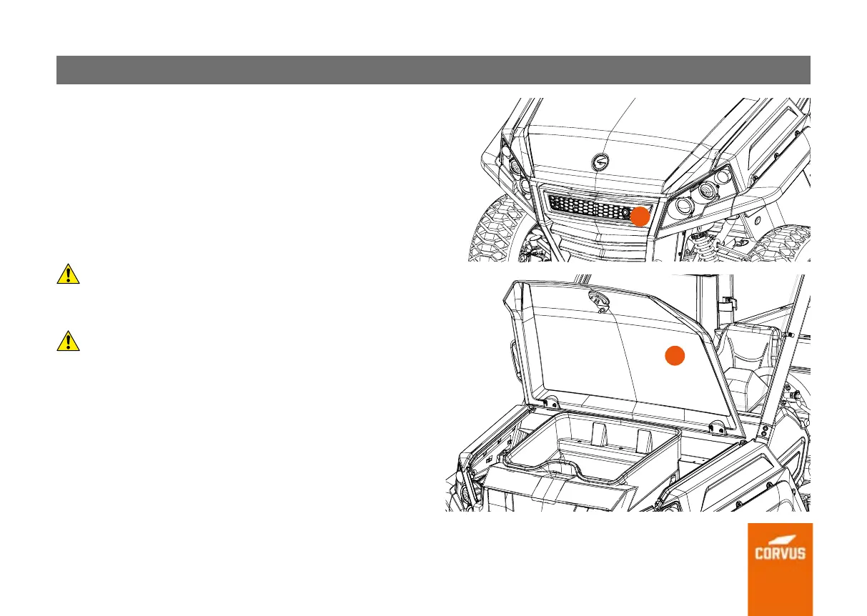 1 - Press the button located on the hood (1).