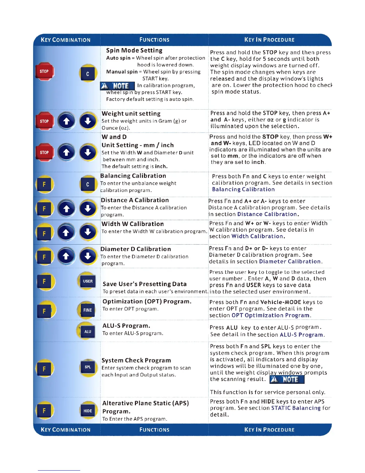 Coseng SP711N - Key Combination Overview; Spin Mode & Weight Unit Settings; Calibration Program Access; Program & User Presets