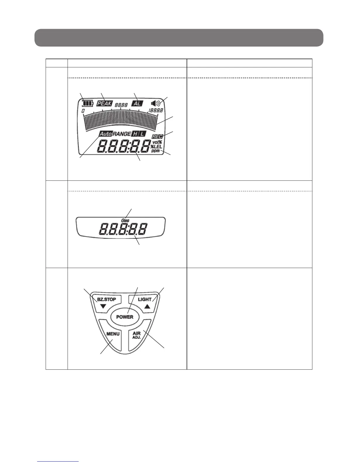 LCD main screen Displays gas concentration and a variety of messages.