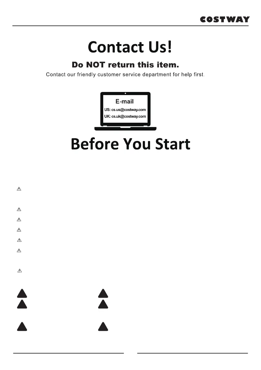 Remove all Packaging, separate and count all parts and hardware before Installation.