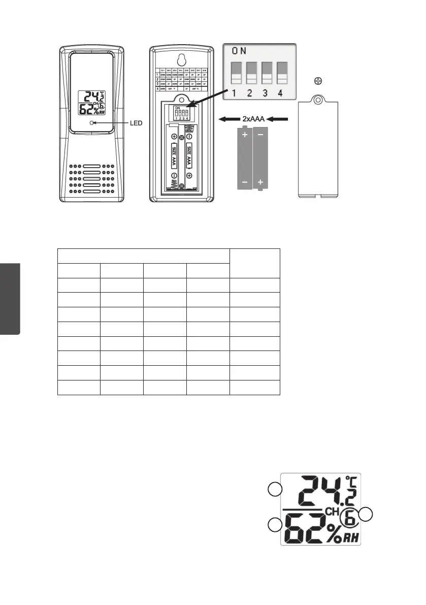 Valitse anturin tiedonlähetyskanava dip-kytkimellä 1−3, ks. taulukko.