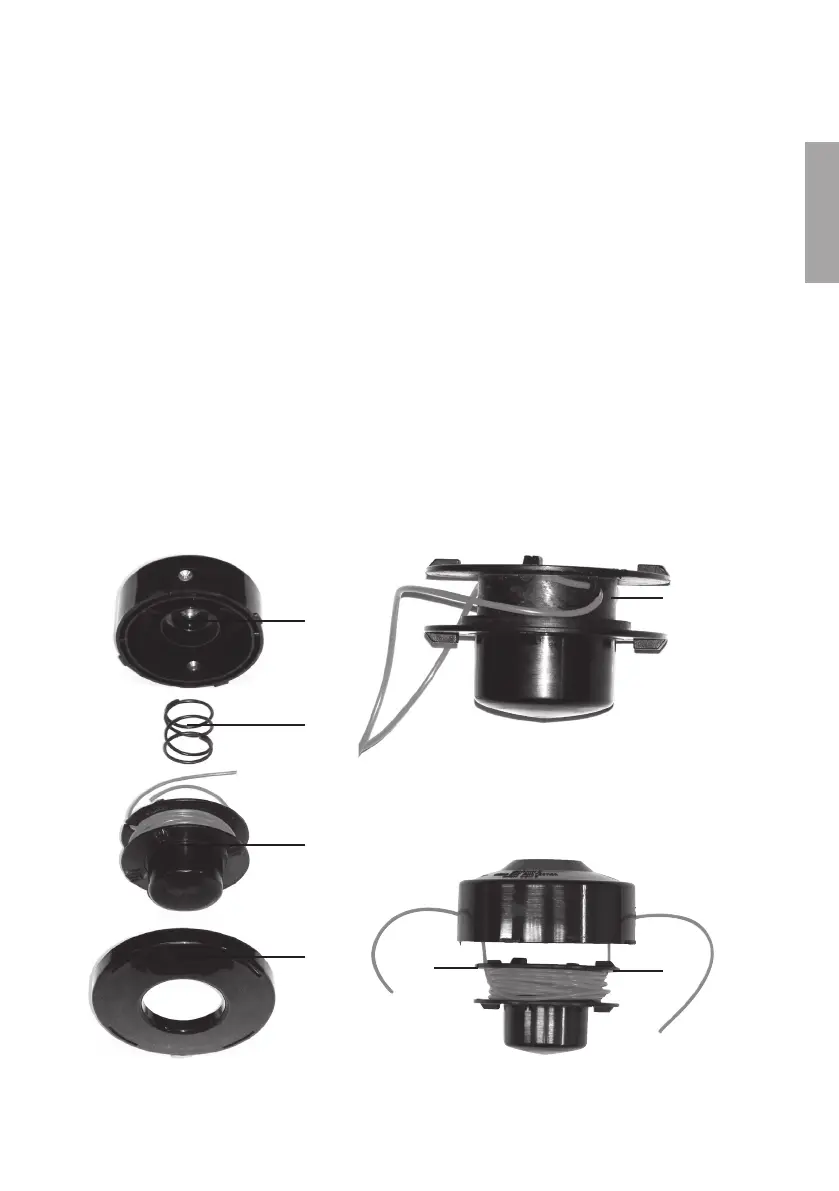 7. Trä linändarna genom dom två hålen i trimmerhuvudet och montera fjädern innan