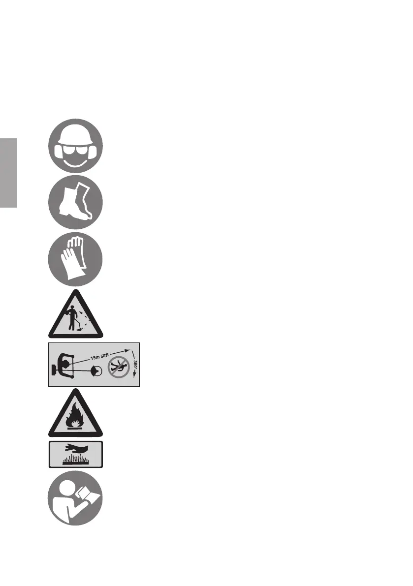 Advarsel: Barn, dyr og tilskuere skal være på minst 15 metres avstand, når gresstrim-