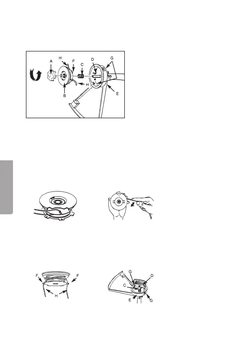 7. Paina jousi (C) kelan alapuolelle (mikäli se ei jo ole kiinni), vedä siimojen päät kuvun (E)