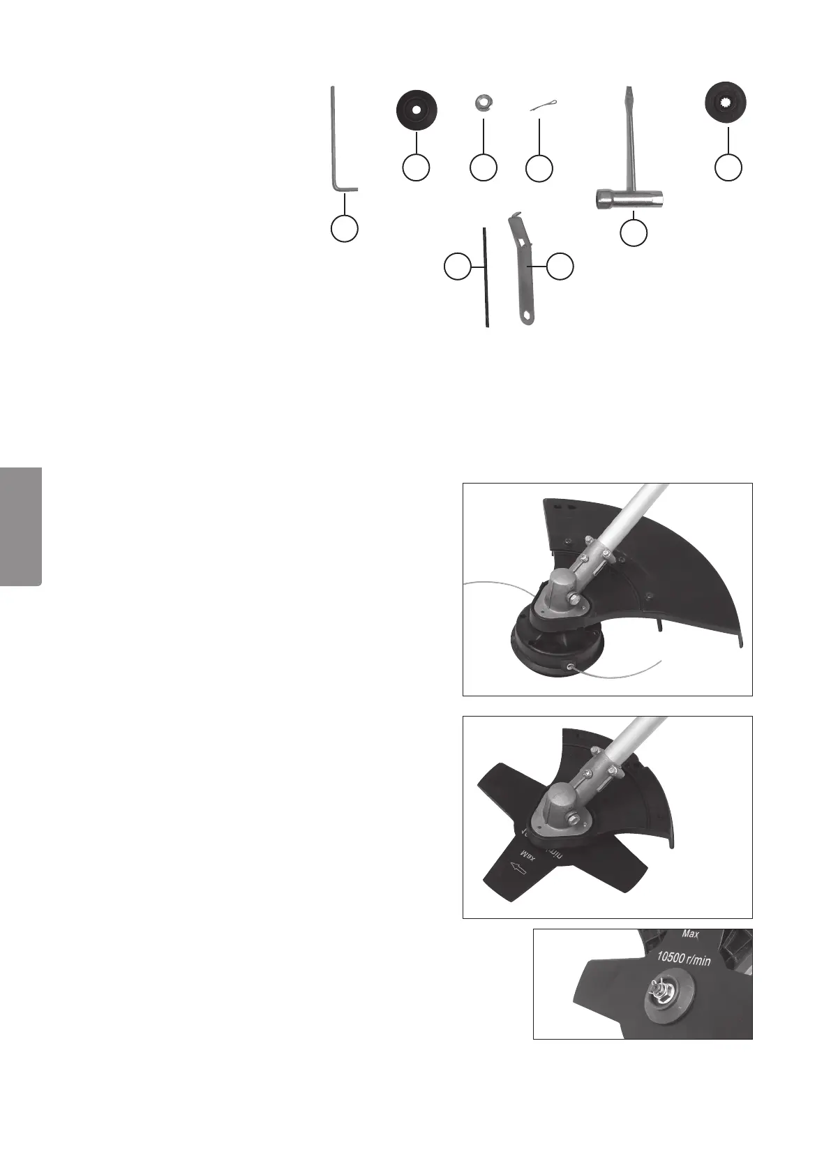 2. Asenna vesakkoterä voimansiirtoakseliin siten, että terän