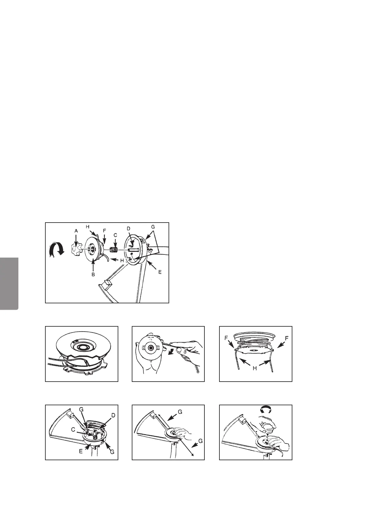 8. Die Spule (B) in dieKappe drücken und gleichzeitig dieFäden durch dieÖffnung (G) herausführen.