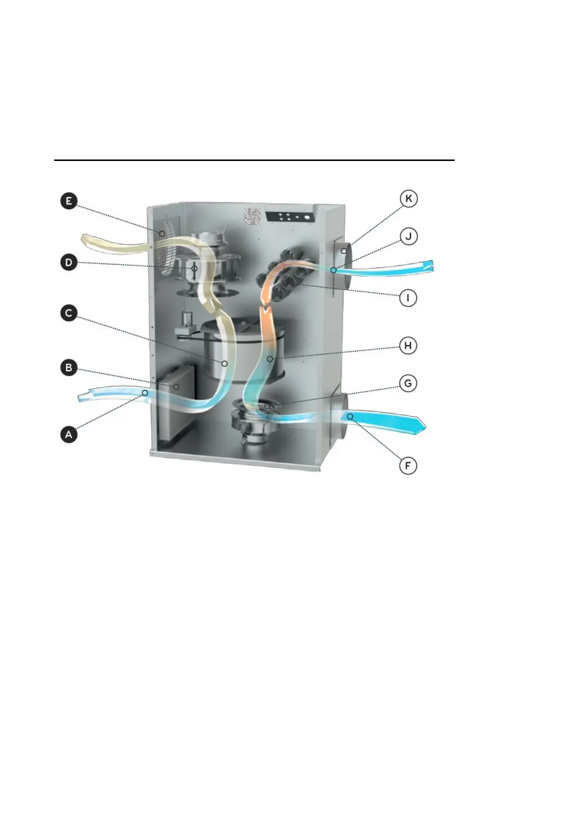 temperature increases during the process. The process air is controlled by a process air fan (D).
