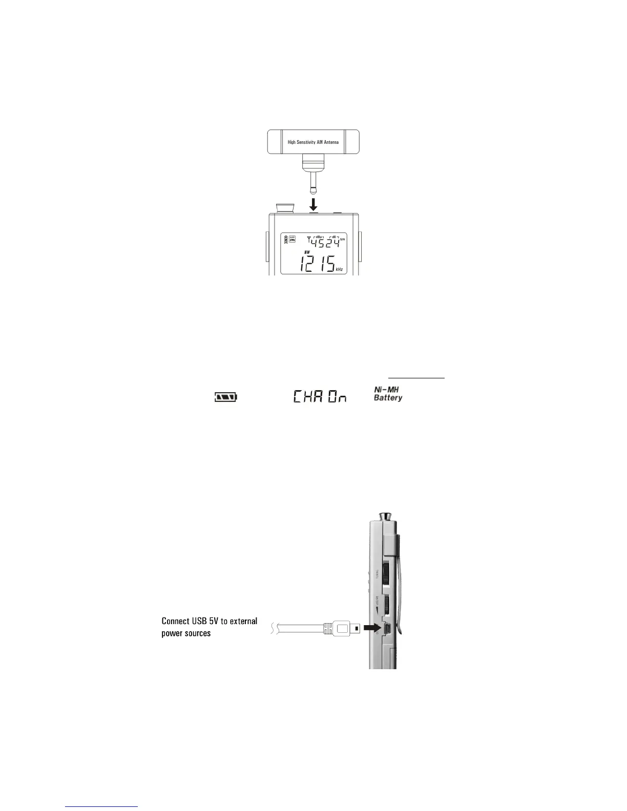 To Charge NiMH Batteries: With radio off, install 3 x UM3 (AA) rechargeable batteries and