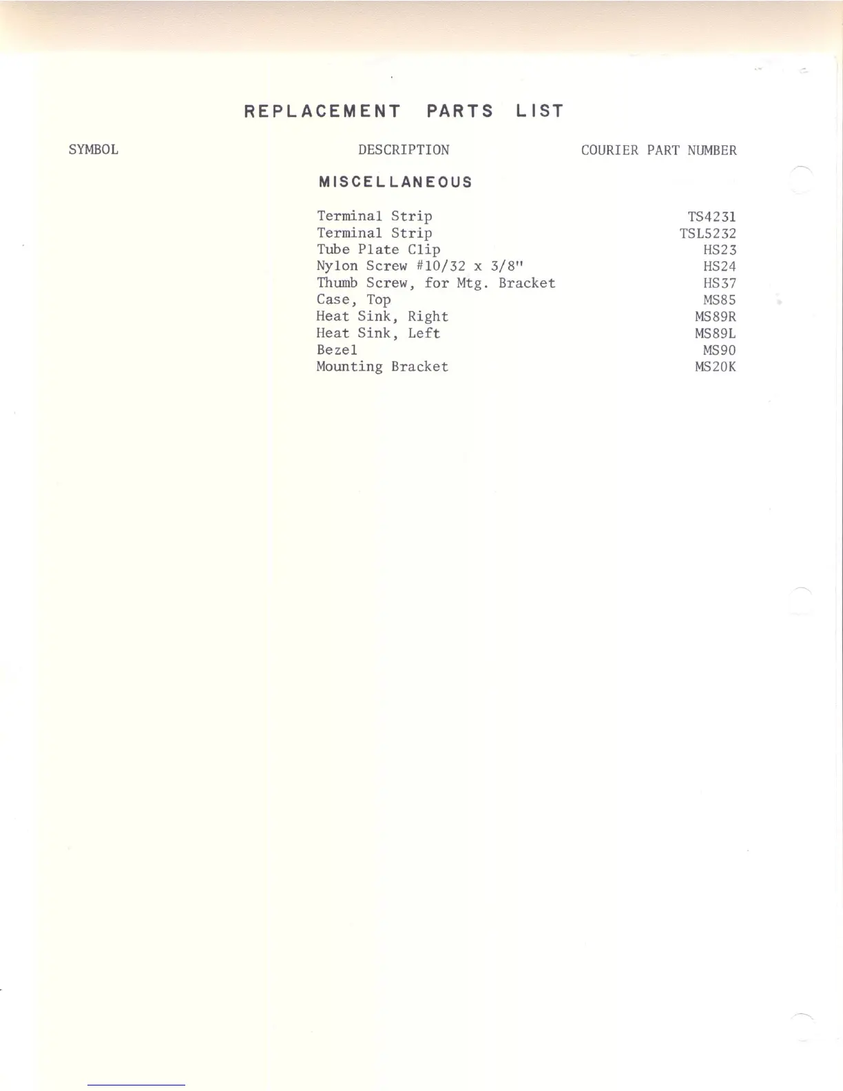 COURIER ML100 - Additional Parts Information; Miscellaneous Items Listing