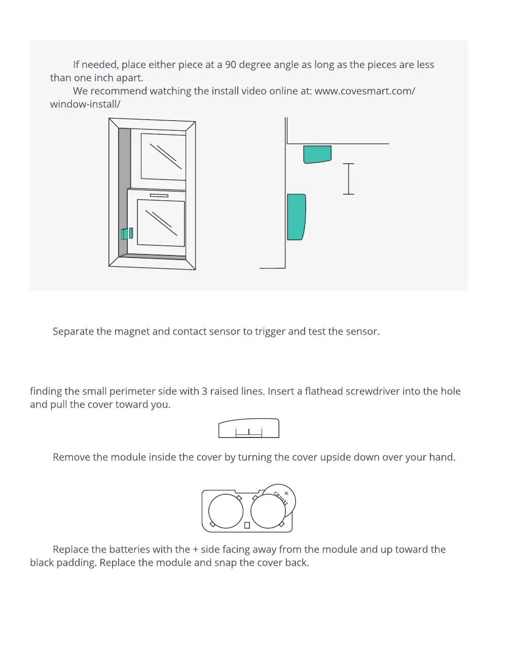Window Sensors require two CR2032 batteries. Open the contact sensor (large piece) by