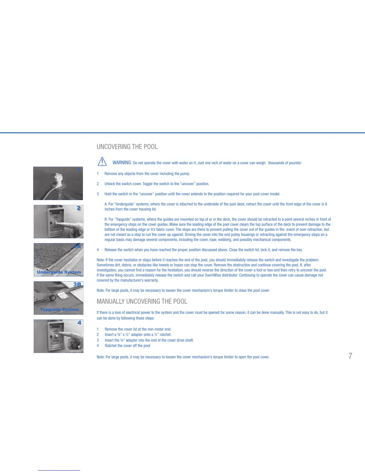 WARNING: $O NOT OPERATE THE COVER WITH WATER ON IT *UST ONE INCH OF WATER ON A COVER CAN WEIGH THOUSANDS OF POUNDS