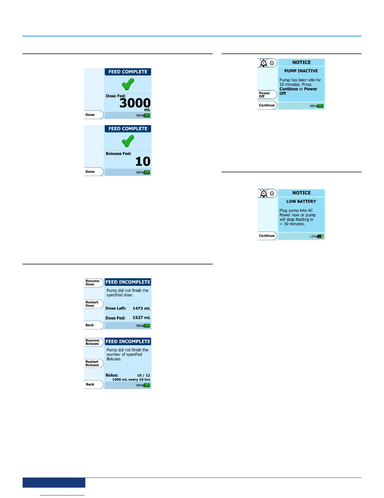 The FEED INCOMPLETE screen will appear if a Dose or Bolus feeding is