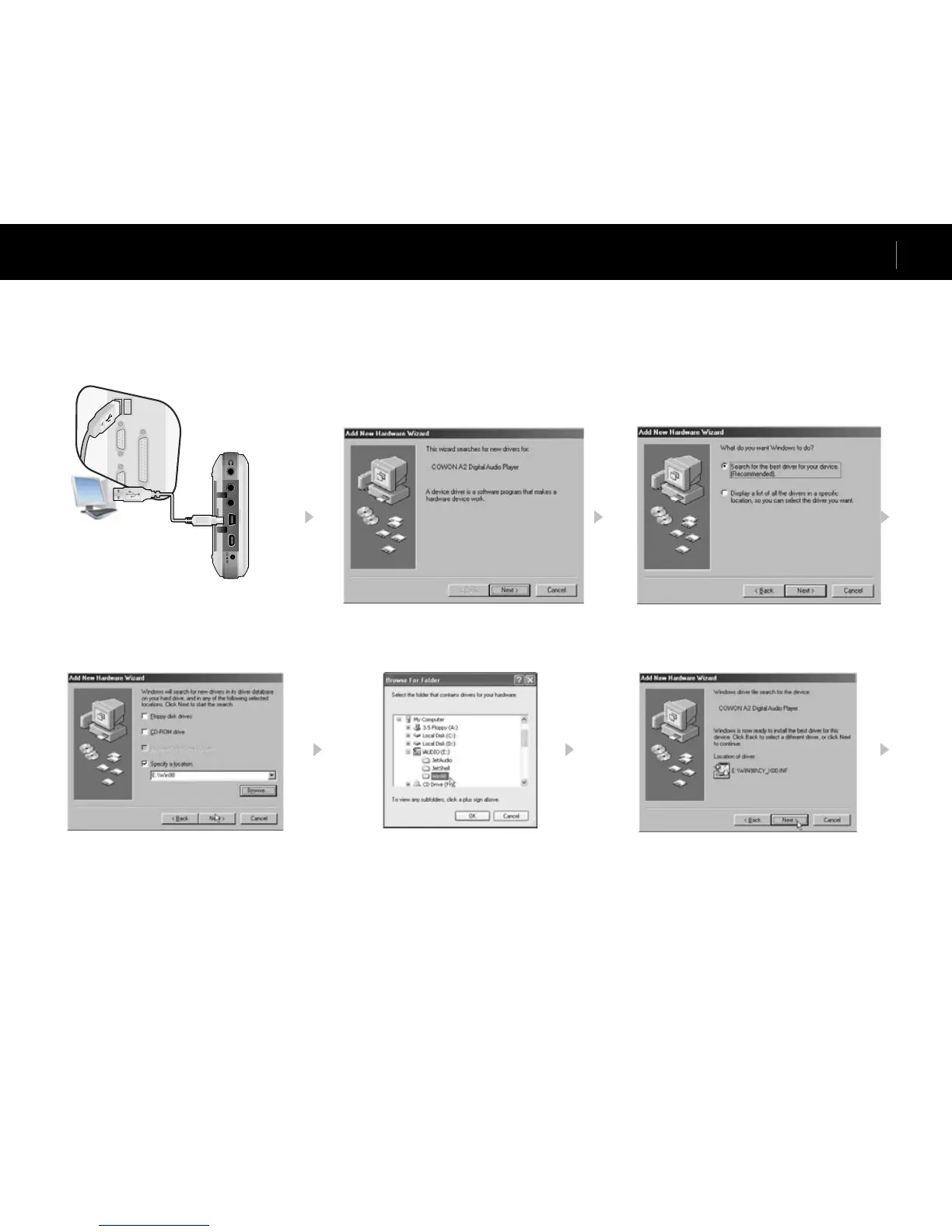 If you are using Windows 98 or 98 SE, you will need to install a separate driver when the player is connected to the computer for the first time.