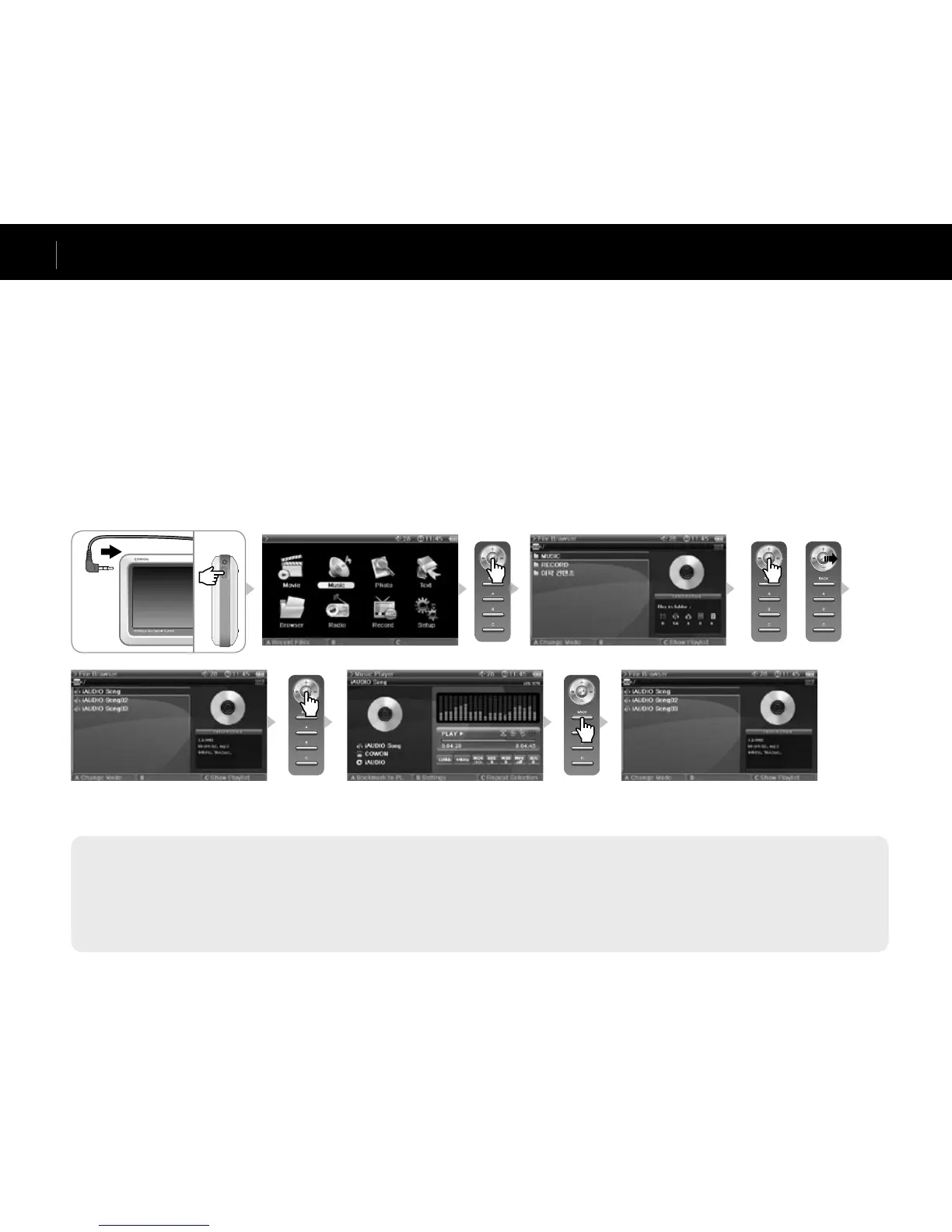 8. Shortly press the “BACK” button during playback and the File Browser will appear. Press the “BACK” button again to go to the Mode Selection screen.