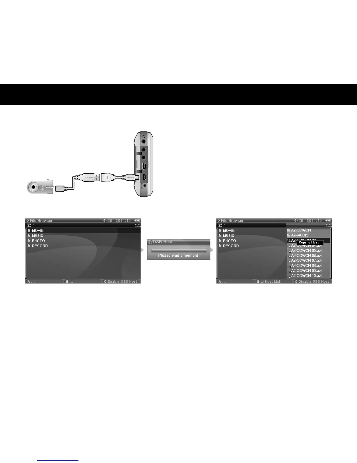 USB Host can copy and delete files and folders in USB compatible devices (digital camera, iAUDIO, etc.).