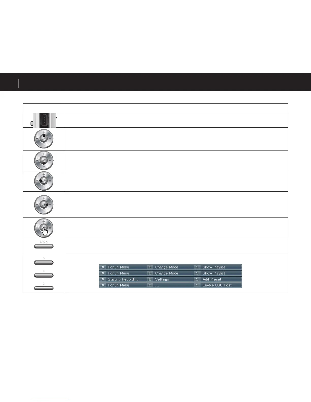 • Cancels popup menus and setting items when pressed. • Press and hold to stop movie, music or radio.