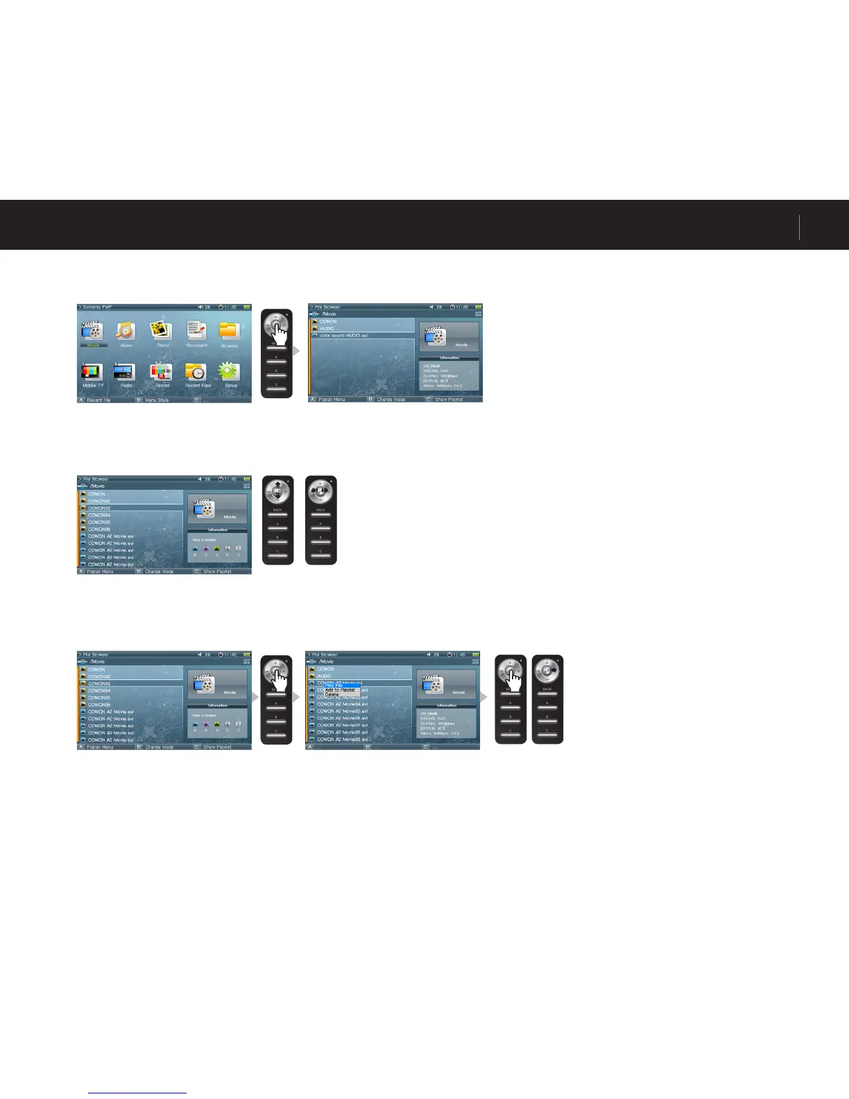 Press the lever in Movie, Music, Photo, Text or Browser mode and the File Browser will appear.