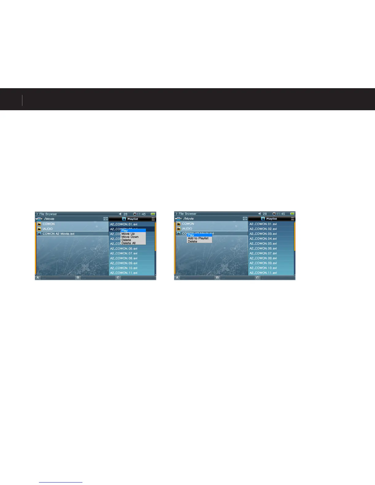 Press the “C” button in the File Browser of Movie, Music, Photo or Document mode to open a playlist. Press the “C” button again to close the playlist.