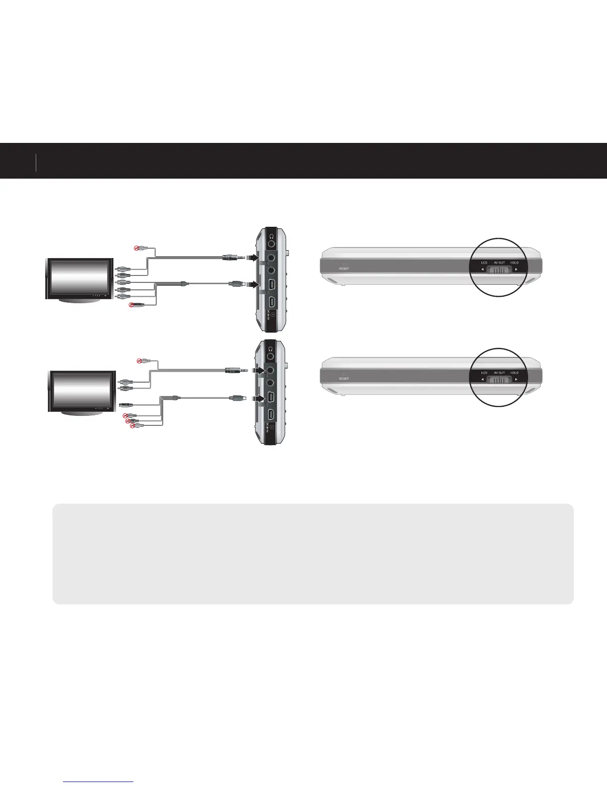 Move the switch at the bottom of A3 to “AV OUT” and the screen from A3 will be displayed on the external AV device.