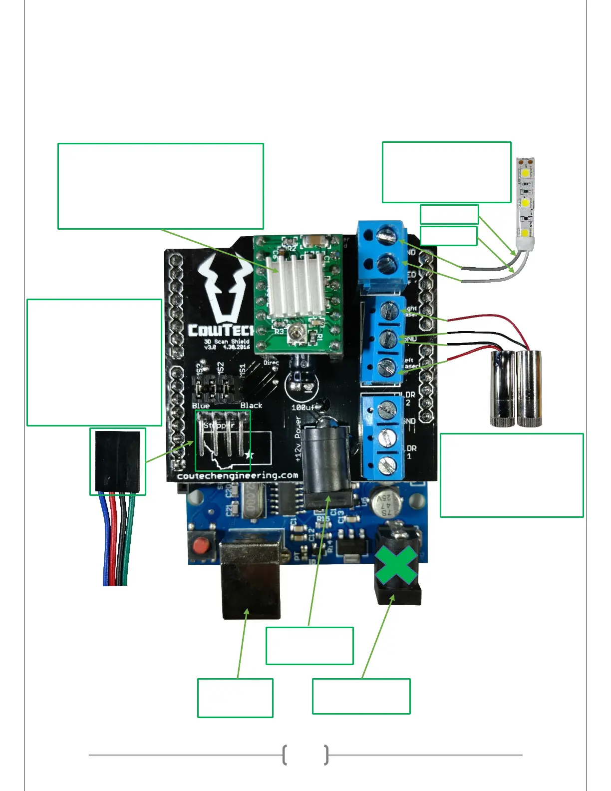 the Stepper Motor Driver if the boards are plugged in incorrectly. The blue connections on the right side