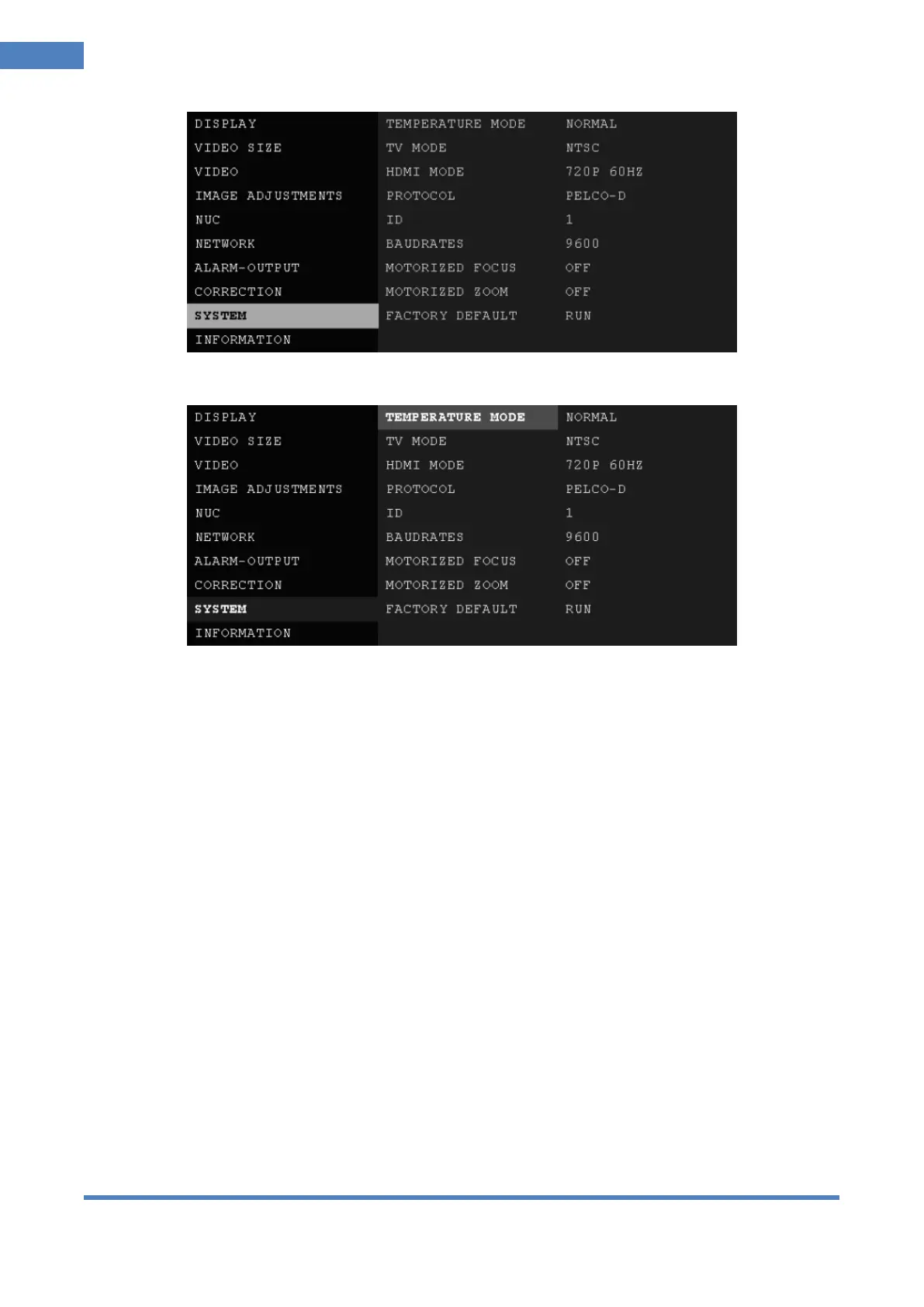 If COX camera is delivered with high temperature detection mode, user can select NORMAL or