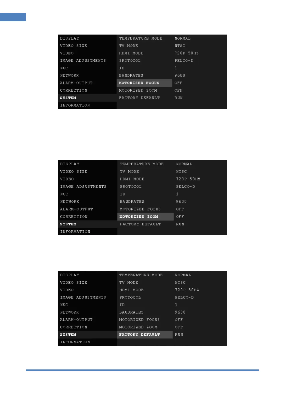 If the camera is not paired with a zoom lens, the 'MOTORIZED ZOOM' menu will not appear on the OSD