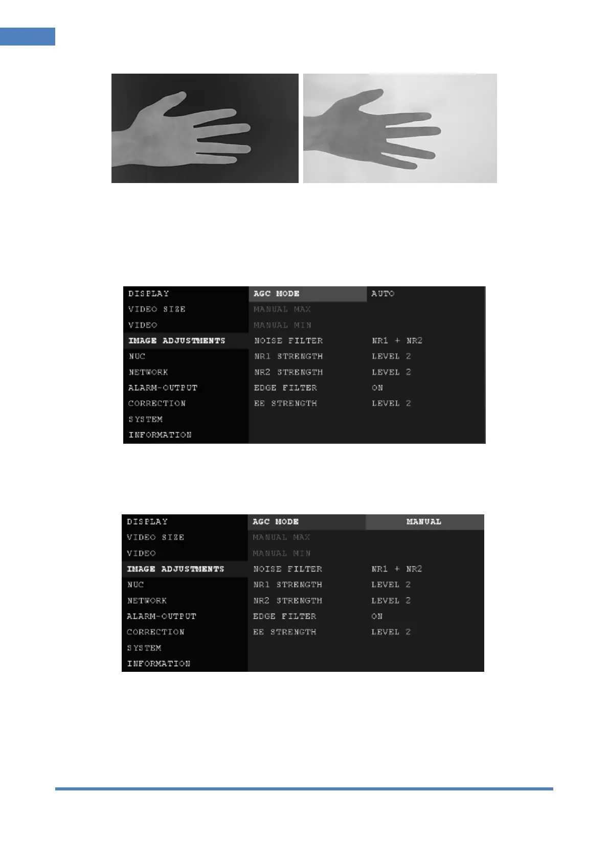 In the IMAGE ADJUSTMENTS Tab, user can set parameters of AGC, NOISE FILTER and EDGE